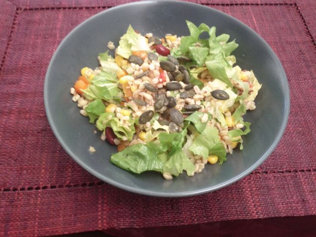 Einfach alle verfügbaren Zutaten klein schneiden, mit gegartem Dinkel vermengen (Kochzeit ca. 10 Minuten, falls er vorgeweicht ist - sonst länger). Mit einem Dressing nach Wahl abschmecken. Zum Beispiel Olivenöl, Weinessig, etwas Ahornsirup, Salz, Pfeffer.