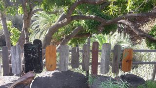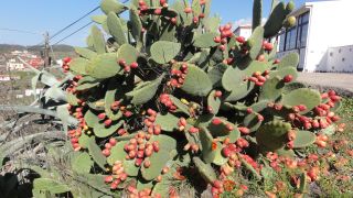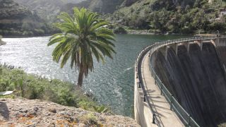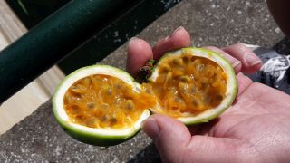 Hier waren wir schon letztes Jahr, allerdings hatten wir zu wenig Zeit zum Wandern. Vallehermoso liegt zwischen steil aufragenden Bergen, besonders markant ist der Schlot Roque Cano. Er ist nach der Erosion als letzter Rest des Vulkans stehen geblieben. Am Rückweg queren wie einen Staudamm und finden als Kletterpflanze an einem Zaun frische Maracujas. |