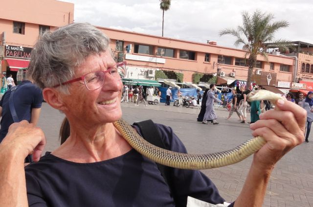 Zum Abschluss dieses einmaligen Tages durchqueren wir noch einmal den „Gauklerplatz“. Um umgerechnet €2,-- darf ich mir eine ungiftige Schlange um den Hals hängen. Sie lässt sich hinter dem Kopf nehmen und wirkt ziemlich gleichgültig. Es gibt aber auch jede Menge sogenannte „Schlangenbeschwörer“. Am Boden, rund um diese Alleinunterhalter, liegen mehrere Kobras – schwarze und farbige. Wir streifen diese nur beim Vorbeigehen, es ist einfach zu unheimlich, wie die Schlangen sich aufstellen, den Kopf hin und her schwingen und dann unvermutet auf irgendwas zustoßen. Laut „Wikipedia“ arbeiten die Beschwörer mit verschiedenen Tricks, damit sie sich nicht selbst gefährden.