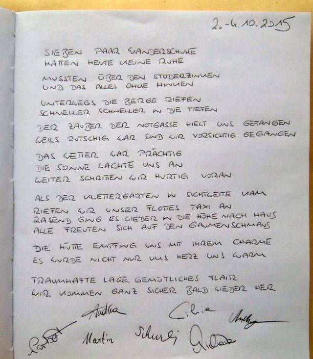 Dann dichten wir gemeinsam für das Hüttenbuch (naja, eigentlich waren nur Michi und Andrea wirklich begnadete Dichterinnen) und sehen uns anschließend noch Fotos von Mallorca und dem heutigen Tag an.