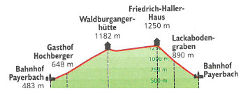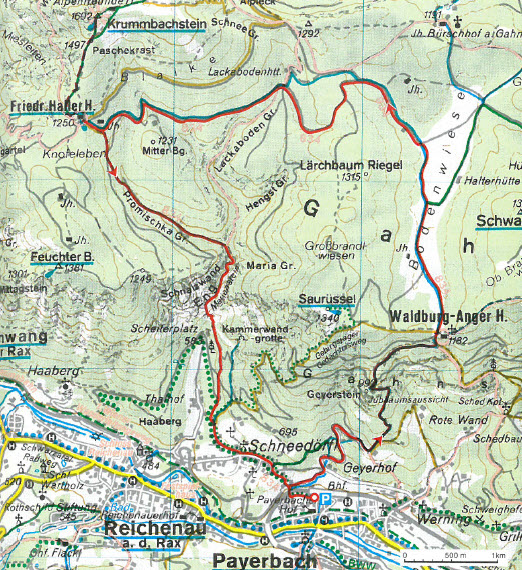Los gehts in Payerbach-Reichenau. Wir parken unter dem impossanten Viadukt, nahe dem Bahnhof. Dort steigen wir über eine (gesperrte) Brücke direkt in unseren gelb markierten Wanderweg ein. Das es auch einfacher gegangen wäre, sehen wir erst kurz danach.