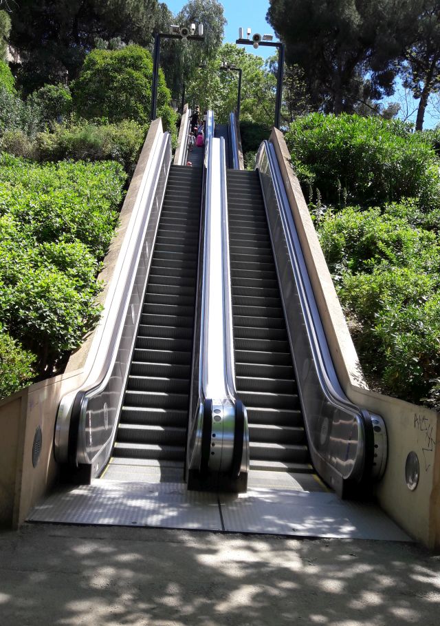Der 173 Meter hohe Montjuïc gilt als der Hausberg der katalanischen Hauptstadt Barcelona. Er ist unter anderem mit der Montjuïc-Standseilbahn und der Hafenseilbahn erreichbar. Oder man erklimmt ihn, so wie wir, mittels Rolltreppe ![]()