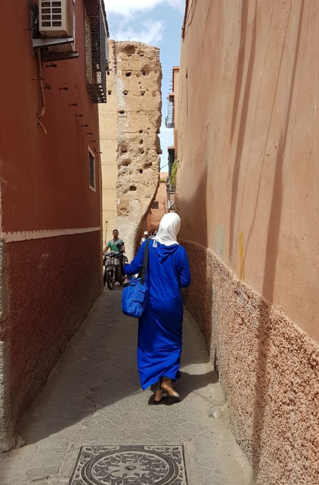 Als nächstes streben wir zu Fuß der Innenstadt zu. Mittelalterliches Flair im Inneren der Stadtmauer empfängt uns. Und hier bekommt nun Andreas Arbeit. Er hat sich eine Offlinekarte von Marrakesch aufs Handy geladen und weiß nun mit Hilfe vom GPS immer genau, wo wir uns befinden. Ohne diese Hilfe wären wir in dem Labyrinth von Gässchen verloren. Es ist faszinierend! Wir können uns nicht satt sehen. Jedes Gässchen ist irgendwie anders, biegt unvermutet ab, endet öfter als Sackgasse, was Andreas aber natürlich schon vorher wusste. Teilweise sind wir alleine unterwegs, keine Touristen und auch nur wenige Einheimische begegnen uns. Anders schaut es in den sogenannten Suqs aus. Links und rechts dieser, ebenfalls sehr schmalen Gassen, haben die verschiedensten Händler ihre offenen Läden. Durch diese Gässchen, die ja von Menschen sehr belebt sind, fahren jede Menge stinkender Mopeds. Die fahren aber so, als hätten sie eine Fahrbahn für sich alleine. Kurven zwischen den Besuchern in relativ hohem Tempo durch. Es ist unglaublich. Wir erleben keinerlei Unfall.