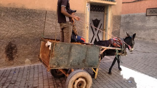 Wir fahren mit dem Bus 1 ganz in die Nähe des Gauklerplatzes und wandern wieder gemächlich durch die Medina und genießen wieder die Gässchen und das ganze Flair. Silvia und Claudia kaufen 1kg Gewürze. Der Duft dieser Gewürze hängt dann auch im Hotelzimmer – sehr angenehm. In den Gässchen kommen uns an diesem Tag kleine Eselsgespanne entgegen. Der Lenker macht durch Rufe auf sich aufmerksam und die Leute bringen ihm ihren Hausmüll. Der wird im Karren gesammelt. Das ist eine besondere Müllabfuhr. Bettler gibt es auch. Sie sind aber auf keinem Fall fordernd. Und dankbar für jede Münze. Eine Frau hat ihren Hausrat in einer Gasse aufgeschichtet. Sie schläft anscheinend auf einem Pappkarton am Boden.