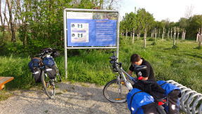 Altbekannter Weg durch die City zum Donaukanal, der erste Kanal auf unserem Weg. Weiter gehts über die Donauinsel. Nach ein paar Kilometern entern wir Transdanubien und landen am Marchfeldkanal. Ein wunderschöner Radweg, wenn man erst einmal die Stadt hinter sich gelassen hat. Wir sehen riesige Spargelfelder und wundern uns, warum die meisten Bauern die Bewässerung nicht versetzt angelegt haben, sondern parallel. Das wäre doch viel effizienter!