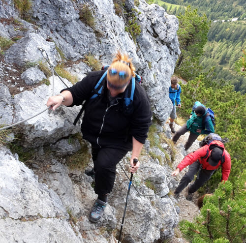 Dann gehts steil bergauf. Über einen Steig (Markierung "Nur für Schwindelfreie") erklimmen wir den Gipfel. Ein paar Schneeflecken zeugen davon, dass das Wetter hier nicht immer so lieblich ist wie heute.