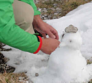 Andreas winkt uns zuerst von einer etwas windigen Hängebrücke zu und baut dann einen Schneepinguin.
